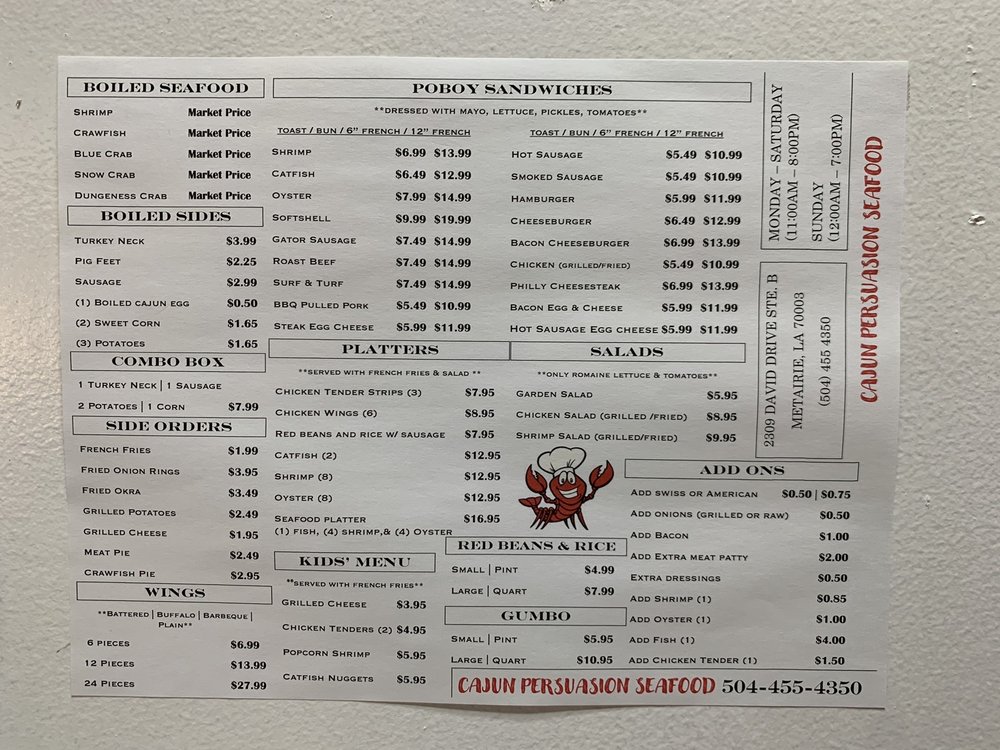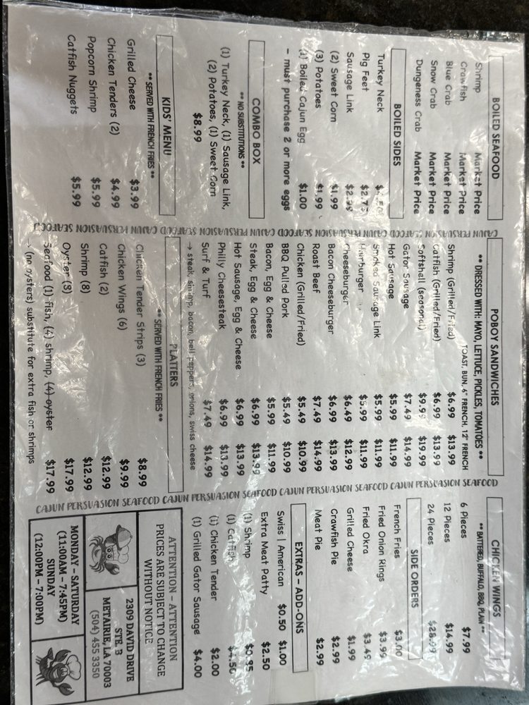 Welcome to Cajun Persuasion Seafood Market & Poboys, a hidden gem in Metairie, Louisiana, where the vibrant essence of Cajun and Creole cuisine captivates seafood lovers. This charming establishment is renowned for its mouthwatering offerings, including robust crawfish, succulent shrimp, and hearty Dungeness crabs. Dive into their delectable boiled sides, featuring tantalizing turkey necks and flavorful Cajun eggs.